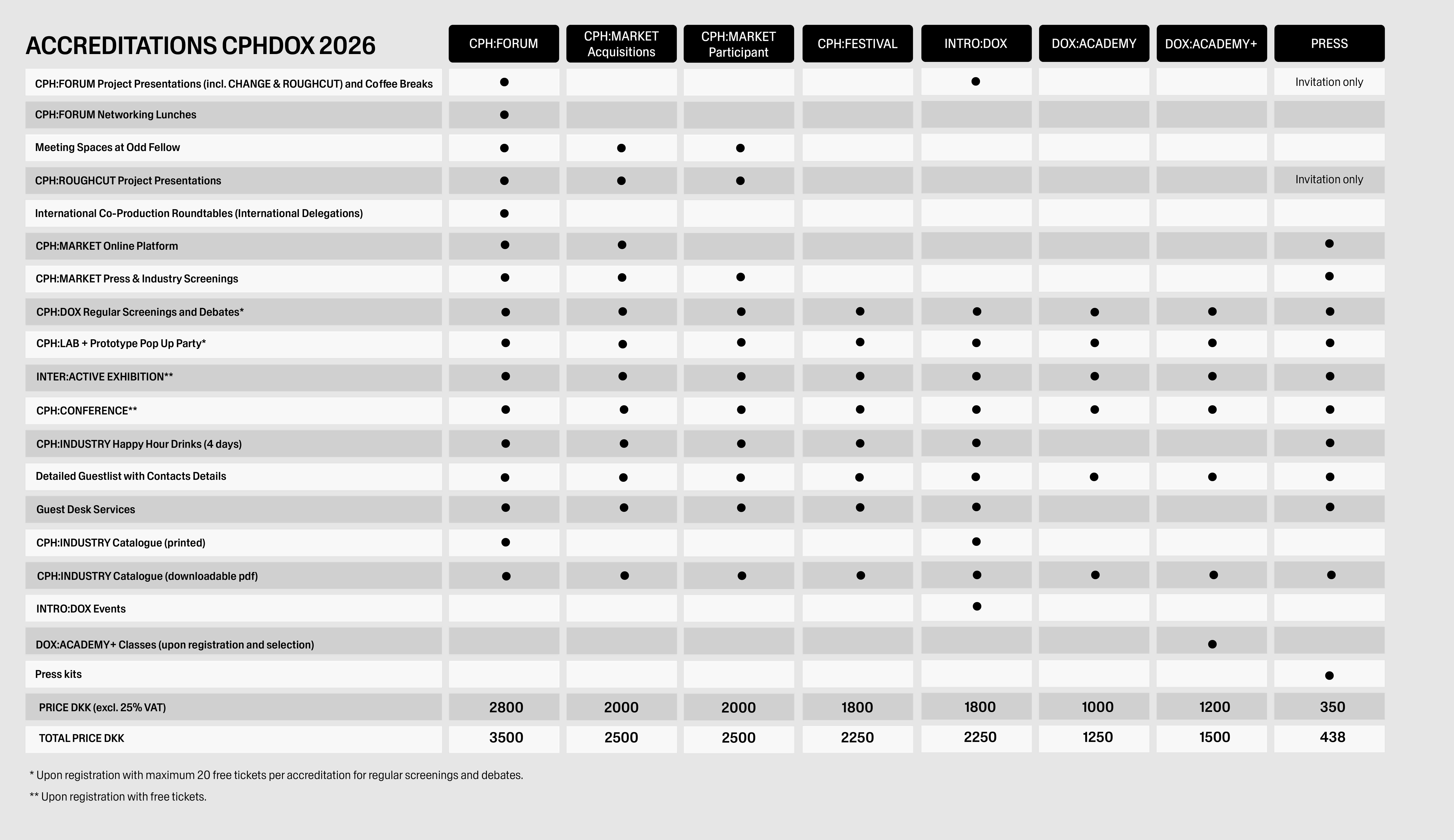 Please note this accreditation does not give access to the CPH:FORUM (including pitches, lunches and meeting space), the online CPH:MARKET platform or automatic access to invitation only events.